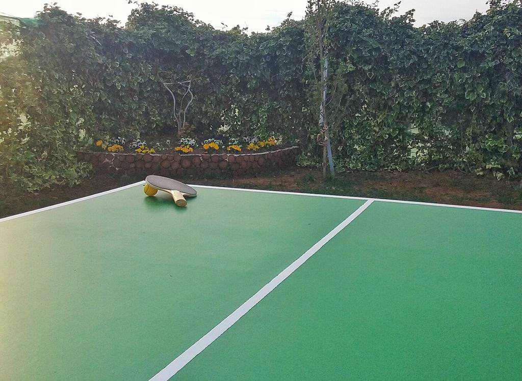 A l'exterior trobem l'ampli jardí amb una petita granja amb animals de corral, parc infantil, porxo amb taules i cadires, un mini-golf, un petit camp de futbol, una barbacoa i una piscina ideal per als mesos d'estiu. A més des del mateix jardí podrem gaudir de les agradables vistes.