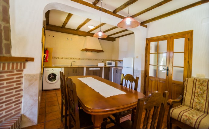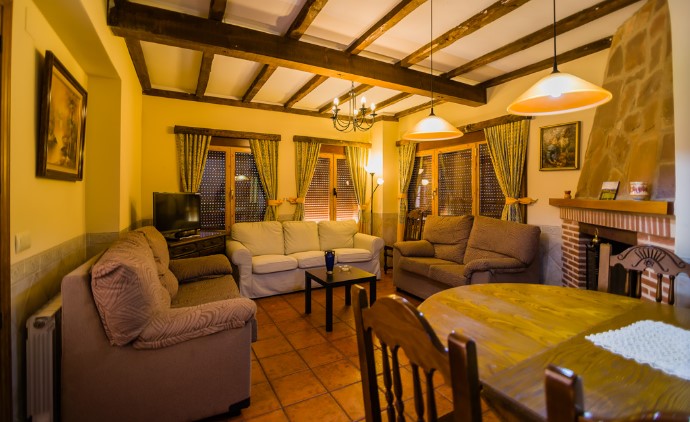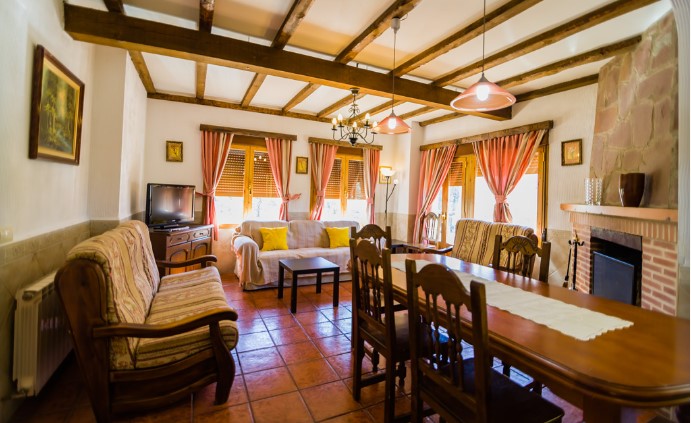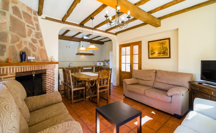 En el interior del habitáculo podrás encontrar un amplio salón con su cocina adyacente, equipado con chimenea, tres sofás , una mesita auxiliar junto a un televisor y una mesa para comer. La cocina está perfectamente equipada para que no te falte de nada, es decir, dispone de frigorífico, microondas, lavadora y una placa de vitrocerámica.