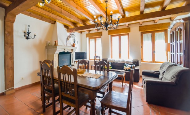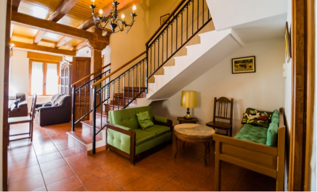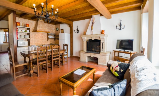 En lo que se refiere a las zonas comunes de la casa, la principal estancia es el salón ya que ofrece un ambiente familiar y acogedor. La chimenea es el principal atractivo de la sala de estar conjuntamente con los sillones y sofás orejeros que la rodean. En el salón también se encuentra la televisión y una amplia mesa a modo de comedor. Tiene calefacción en toda la casa para sobrellevar mejor la estancia en las épocas más frías.